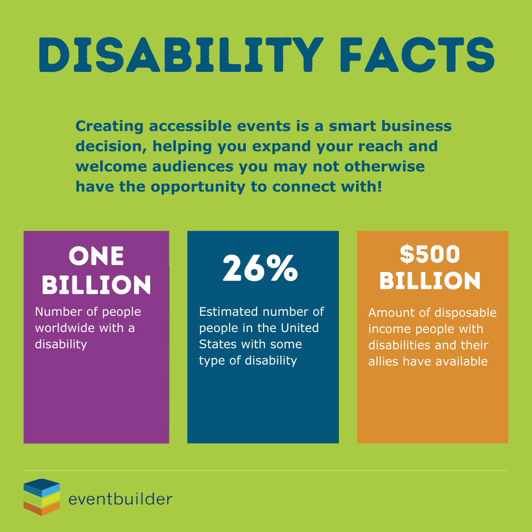 - Communicate Accessibility Options - Transparency is key - build trust by letting attendees know what accessibility options you have available well in advance, and include your accessibility information on invitations, registration forms, and promotional materials. Empower them to request additional accommodations on your event's registration form if needed.