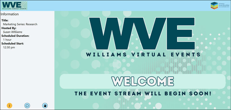 Appears in the EventBuilder Attendee viewing console before and after your live streamed event. (Available to Suite and Enterprise level subscribers only.)