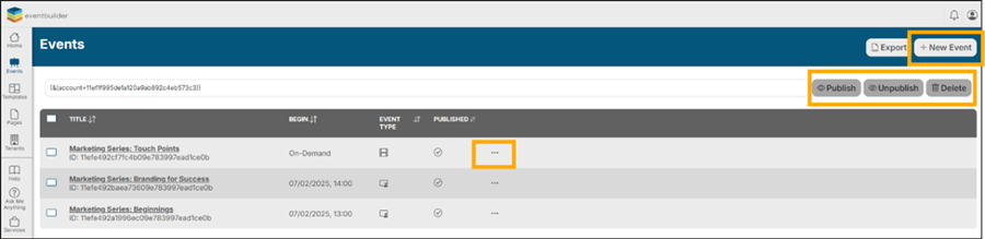 Click on the ellipsis (three dots) by each Event entry to quickly: Copy Registration URL, Visit Registration Page, Publish, Unpublish, Copy, or Delete an Event.
