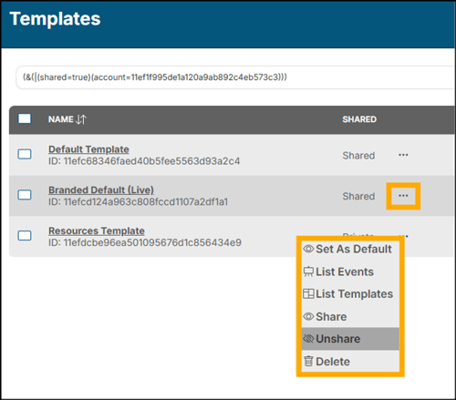 You may also click on the ellipsis by each Template entry to quickly: Set as Default, view a List of Events created from this Template, view a list of Templates created from this Template, Share, Unshare, or Delete a Template: