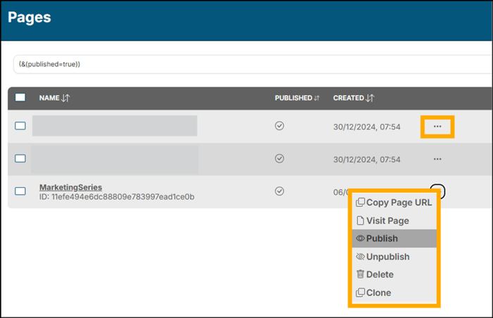 You may also utilize the ellipsis by each Page entry to quickly: Copy Page URL, Visit Page, Publish, Unpublish, Delete, or Clone a Page: