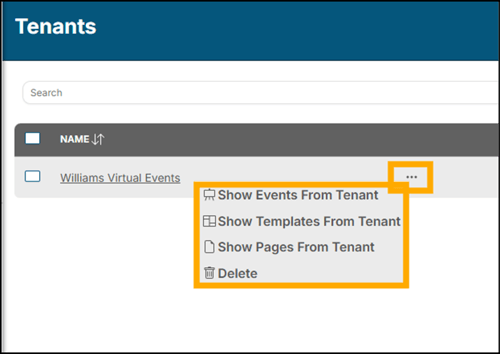 You may also utilize the ellipsis by any Tenant entry to quickly: Show Events, Templates, or Pages from your Tenant: