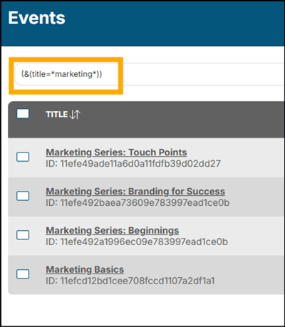 You will return a list of all your Events with Marketing included in the Title: