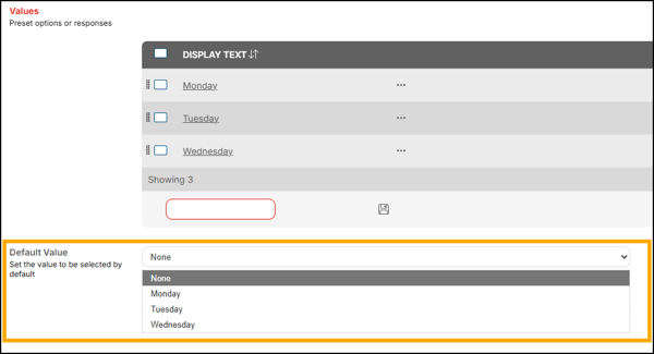 Set a default Value for your questions based on the options you have created. This field is set at 'none' by default. Select your desired value from the drop down menu.